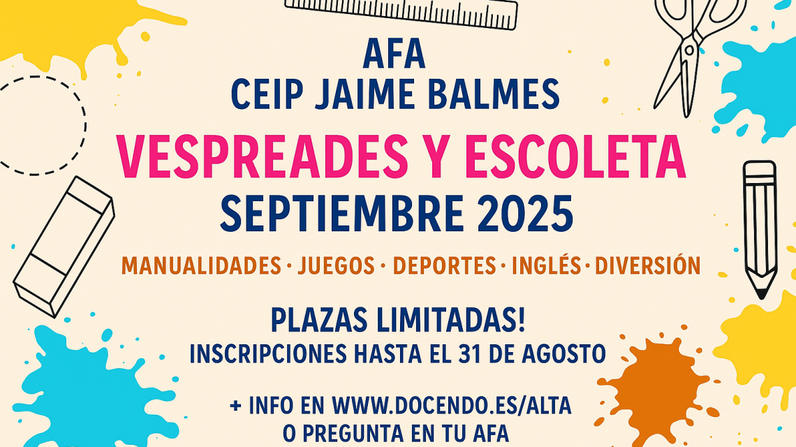 Inscripciones Escoleta y Vesprades Septiembre Ya están disponibles las inscripciones en la web, a las actividades de Concilianción de Familias de Septiembre 2025-26. ESCOLETA SEPTIEMBRE Y VESPRADES ( ARTEMANIA ) Este año volvemos a ofertar la Escoleta de septiembre en el CEIP Jaime Balmes para facilitar la conciliación. Contaremos otra vez con Docendo para llevarla a cabo. La escuela dará comienzo el 1 de septiembre, y finalizará el 5. Encontraréis…